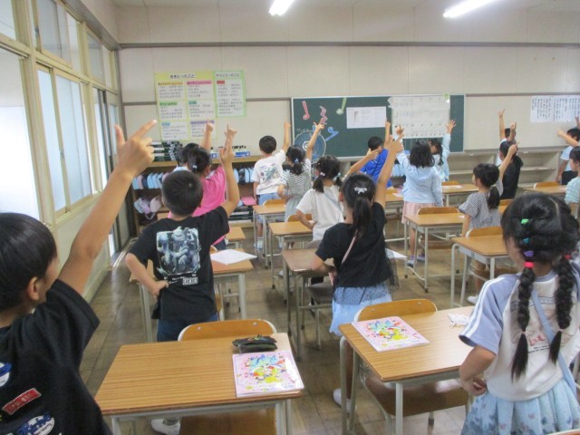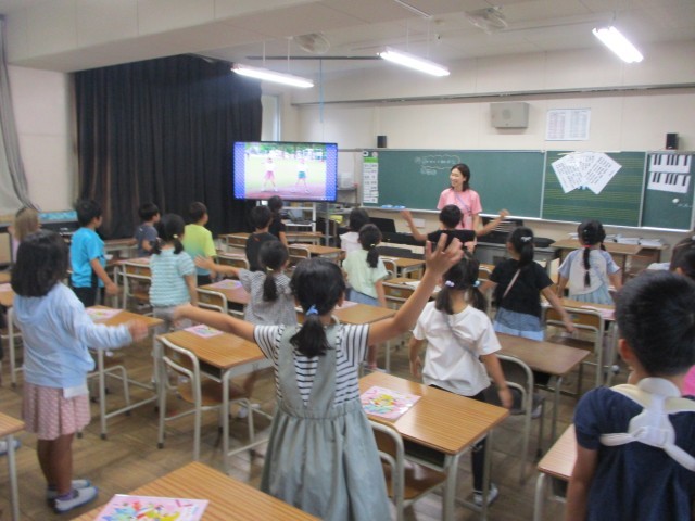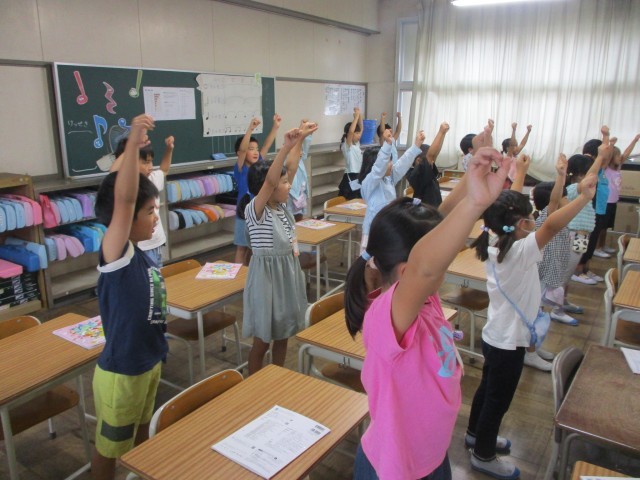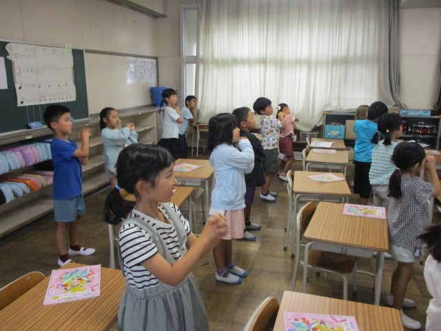 音楽の時間に「学園天国」の曲に合わせてダンスをしました。
