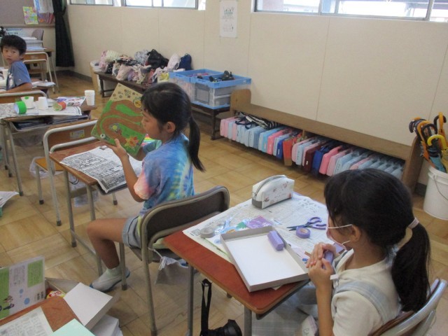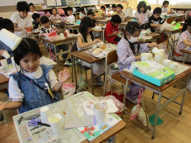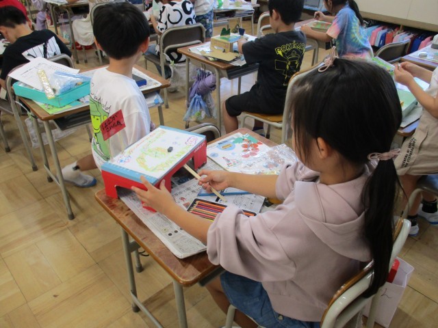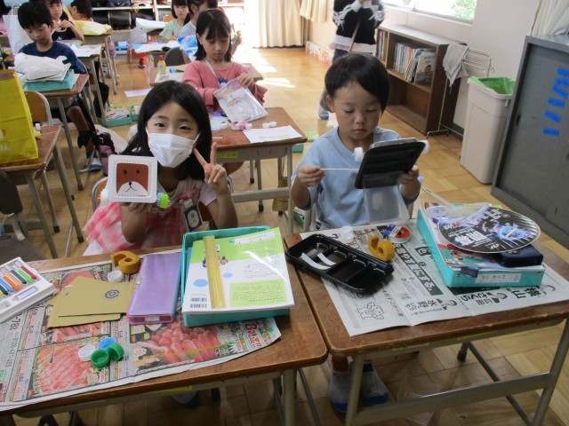 生活科の時間にヨットカーや迷路、ぴょんコップ、コロコロコロンなどのうごくおもちゃを作っています。