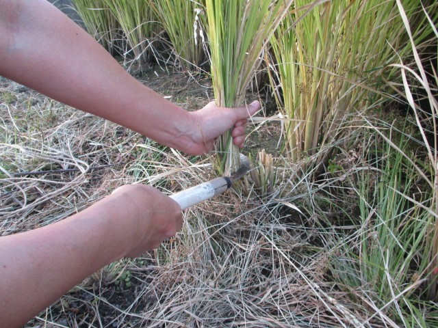 写真のように、利き手ではない方で握ります。そして、利き手でカマをもち、稲を刈ります。