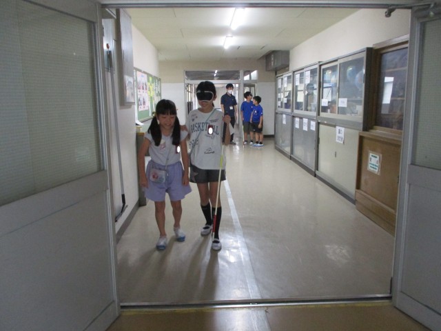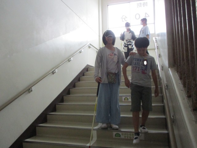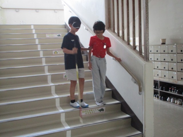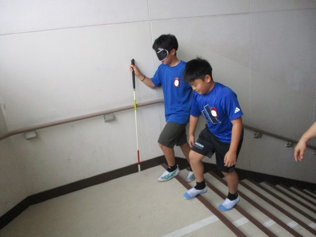 二人一組になって体験をしました。ガイドヘルプ役の子は声のかけ方やタイミングがだんだん上手になっていました。
