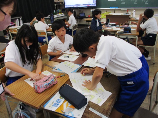 長方形の面積の公式を使ってL字型や凹型、凸型などの面積を考えました。