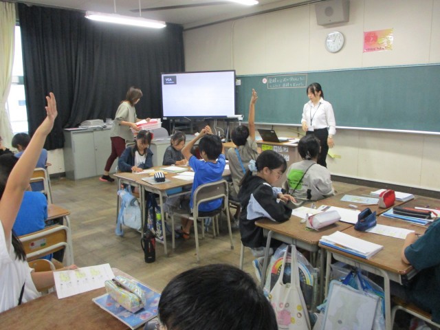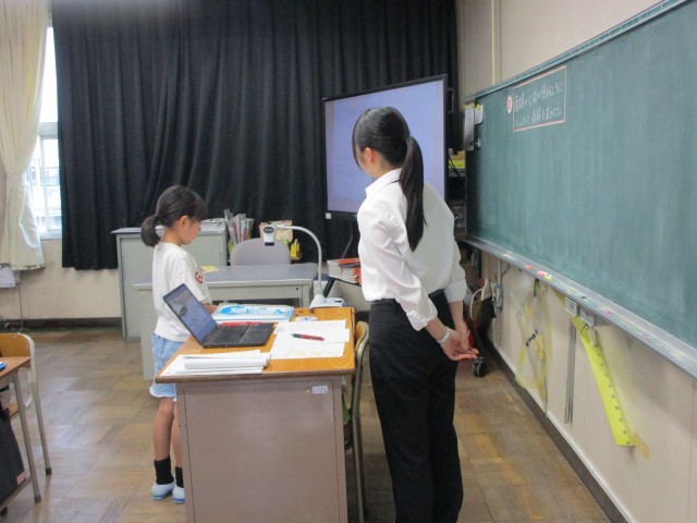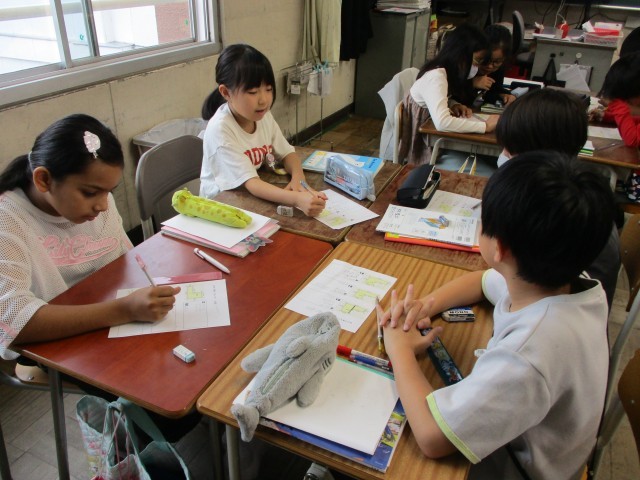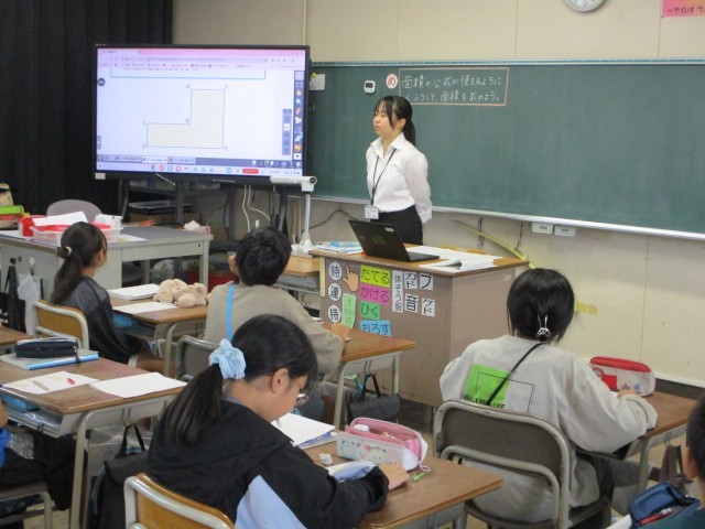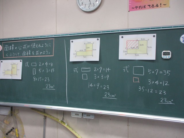 算数の時間に長方形と正方形を組み合わせた図形の面積を求めました。