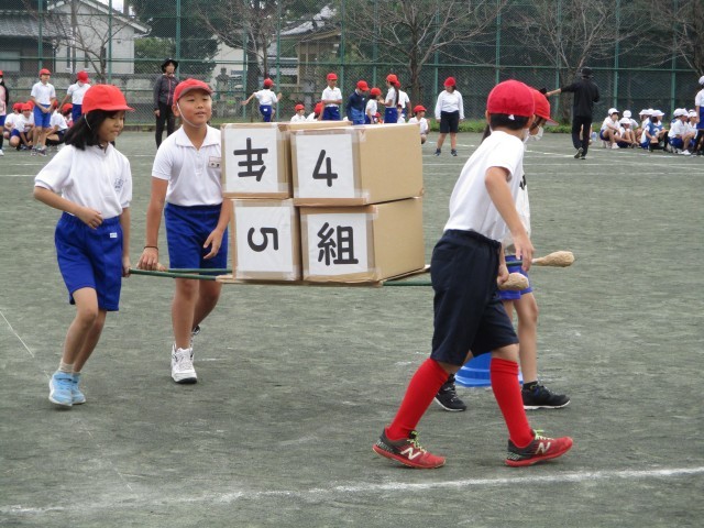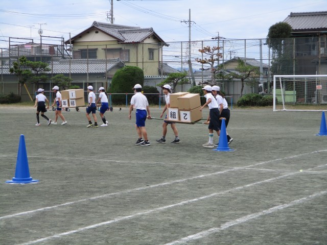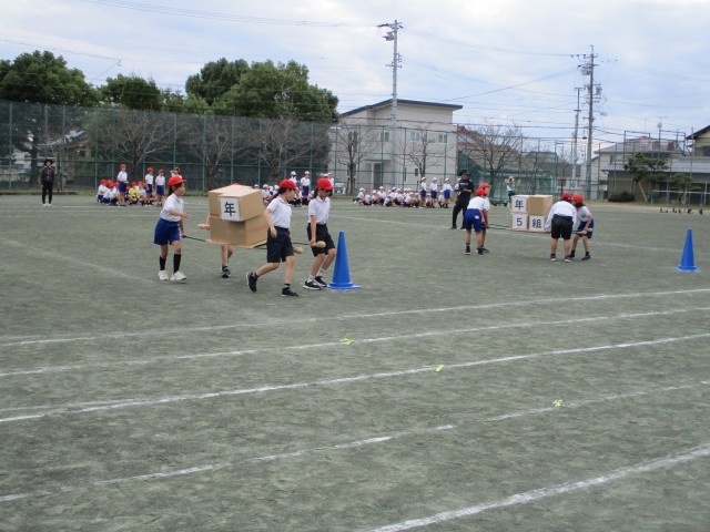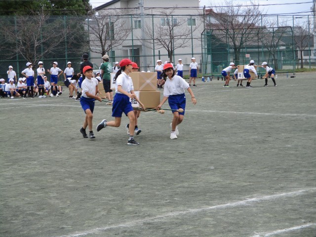 5年生は競走遊戯で「段ボール運びリレー」をします。