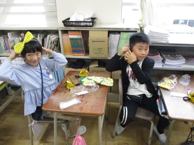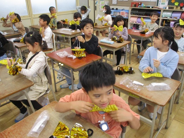 スポーツ大会で使うリボンと小さなボンボンが配られてみんな大喜びでした。