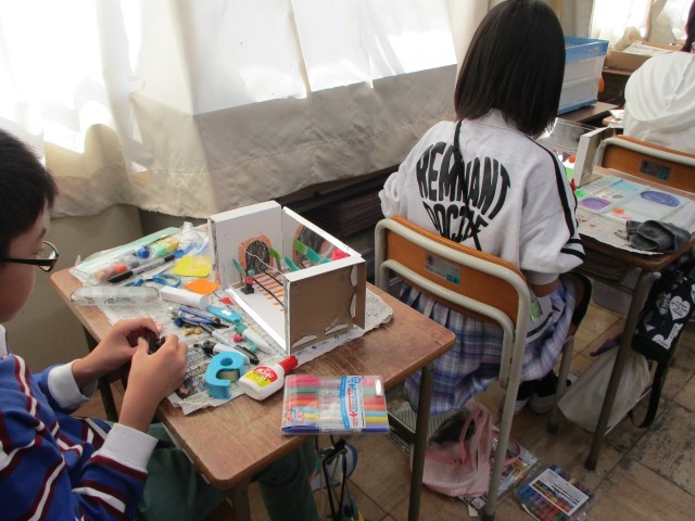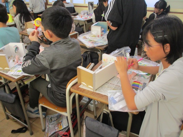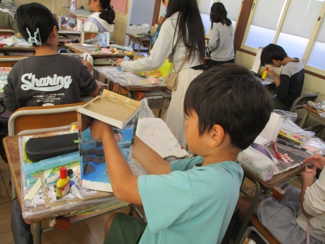 図工の時間に「ミラクル!ミラーワールド」という鏡の反射を生かした工作をしています。