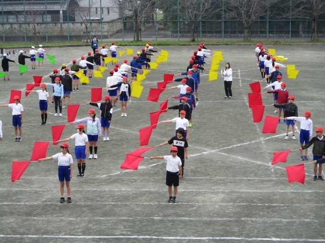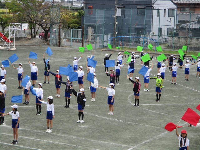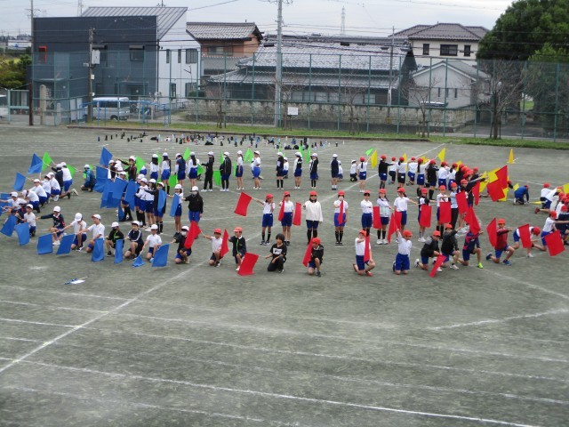 表現の練習をがんばっています。旗を上げたり下げたりするときにそろうよう、タイミングを合わせて振る練習をしています。また、隊形移動が多く、そろえて動けるよう息を合わせて動きます。毎日練習がありますが、みんな一生懸命練習しています。本番まであと1週間ちょっとになります。みんなそろって動けるよう、がんばっていきましょう。