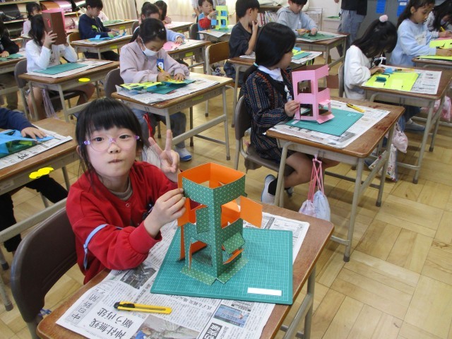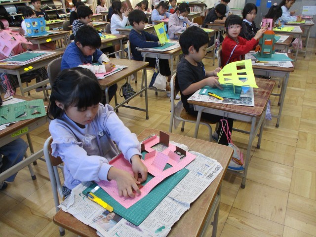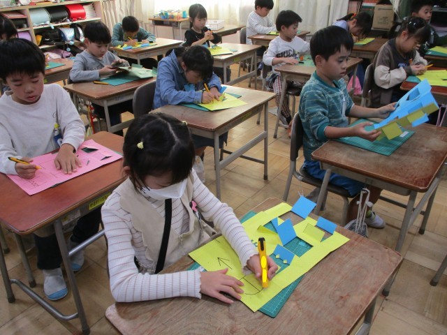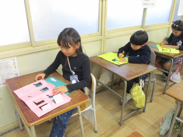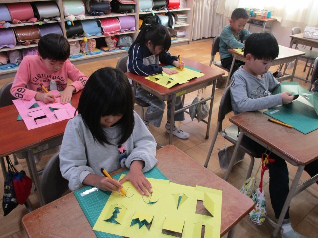 今日はいろいろな形の窓を厚紙にかいてカッターナイフで切りました。