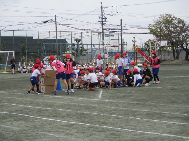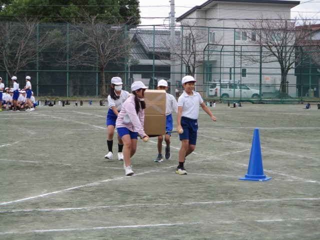 4人一組で段ボールを運びますが、落とさないように運ぶのが難しそうでした。