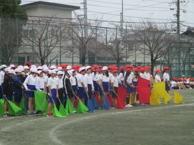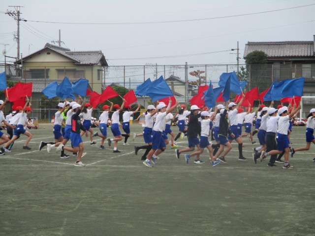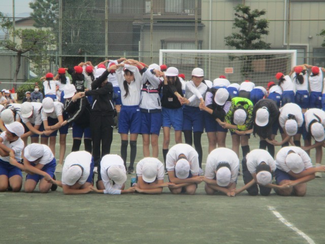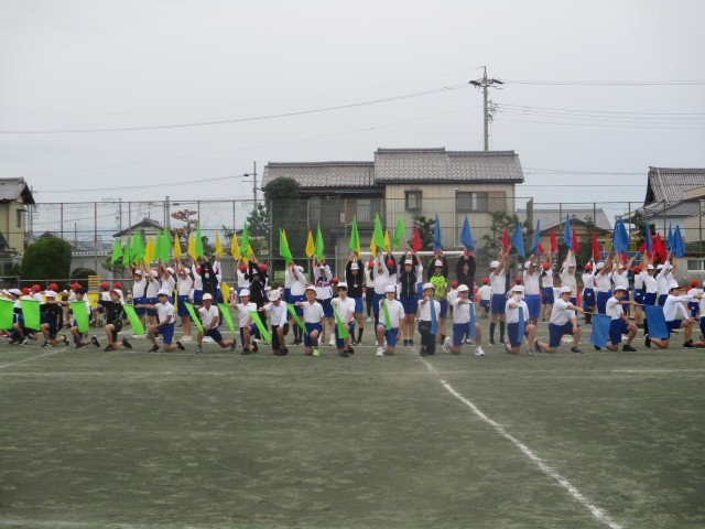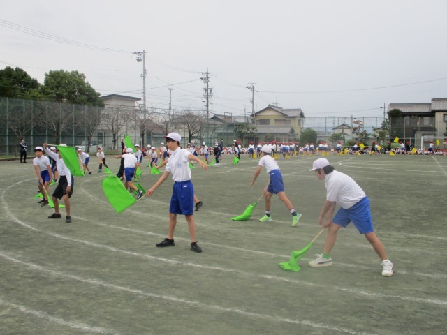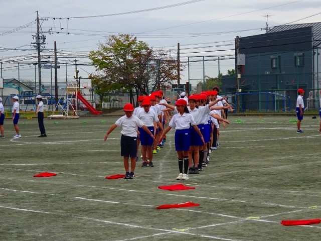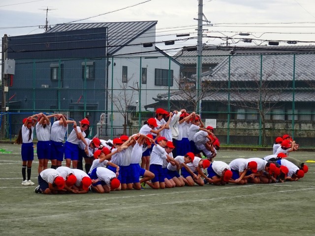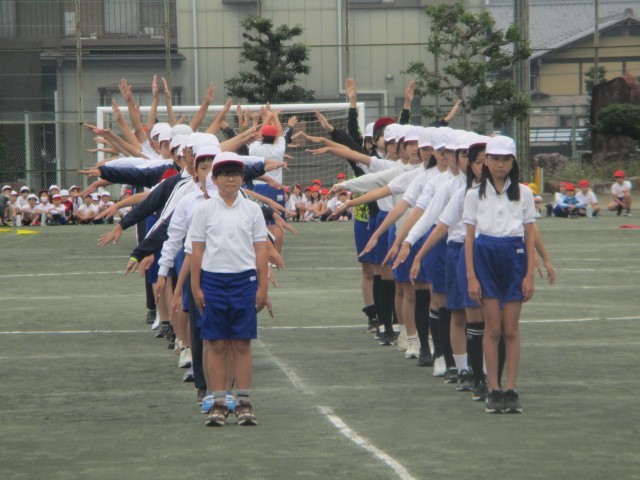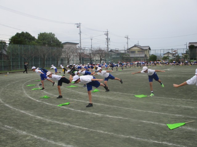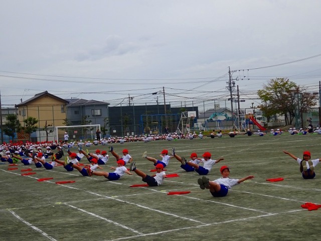 スポーツ大会に向けて練習してきた演技を、全校に発表しました。他の学年からは、「うわー。」「すごい!」と演技のたびに歓声が上がっていました。