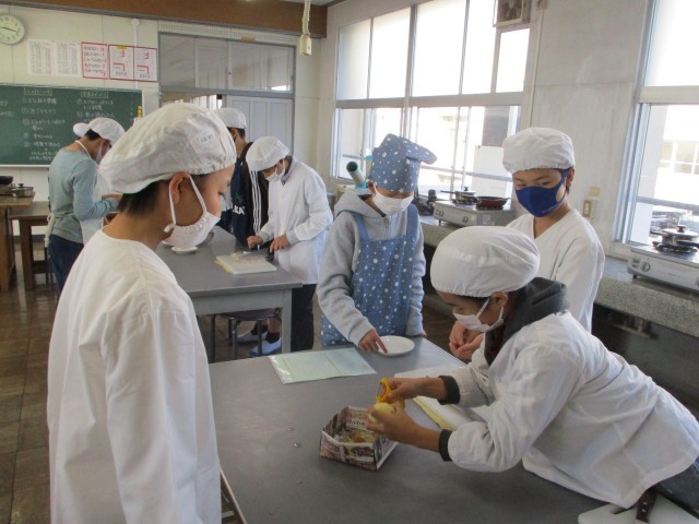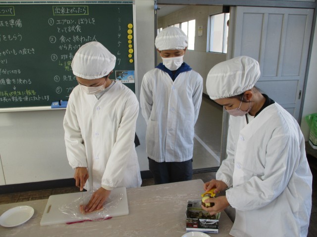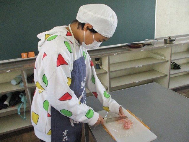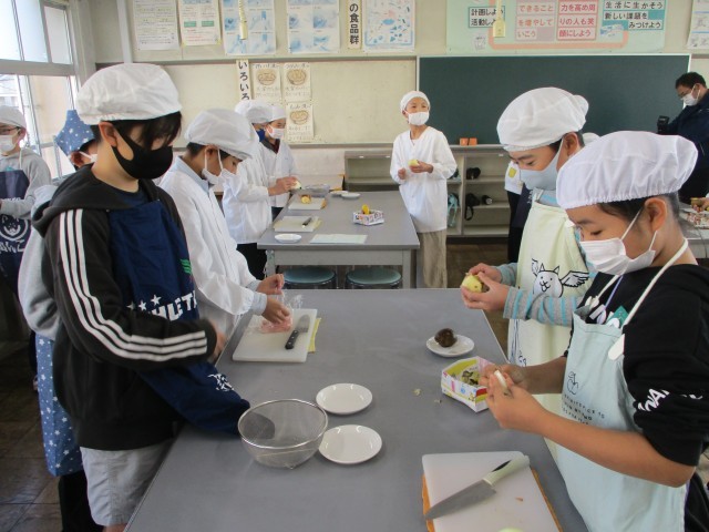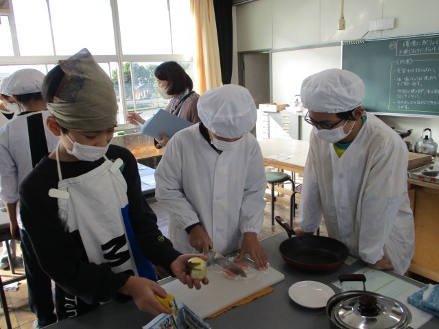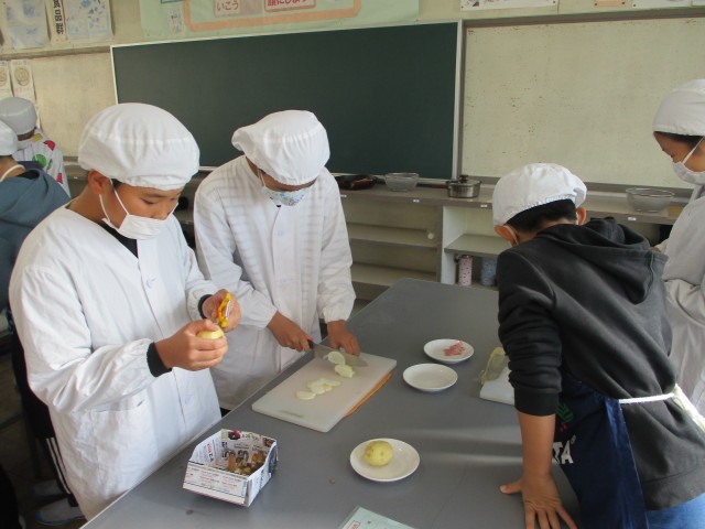 調理実習をしている様子です。じゃがいもや玉ねぎなど、丁寧に皮をむき、包丁で慎重に切っています。