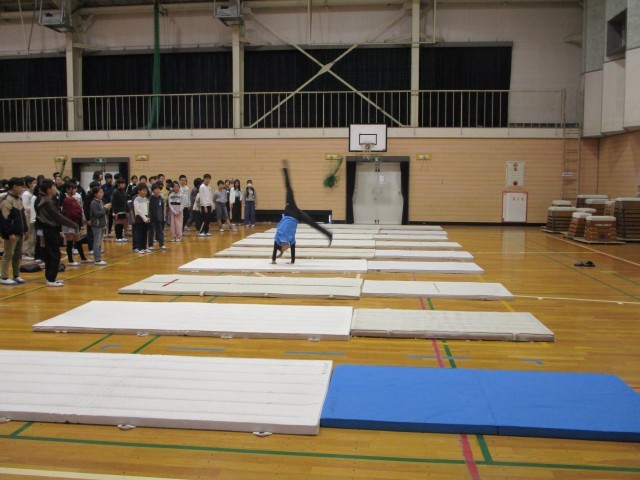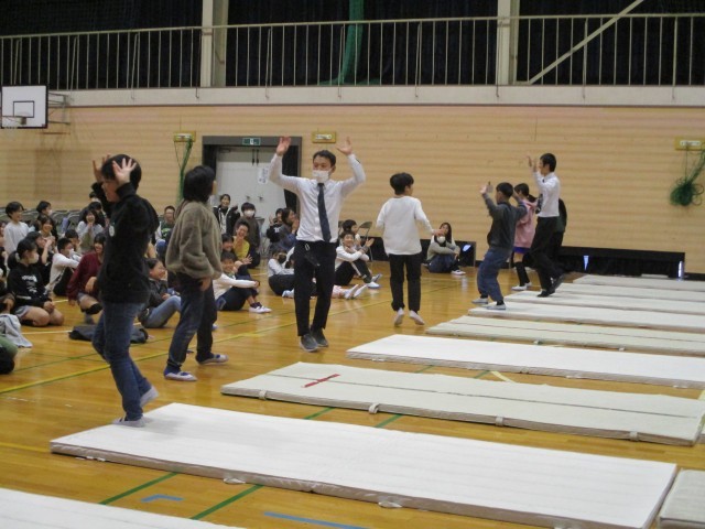 次にMrs. GREEN APPLEの曲に合わせて簡単なダンスと前転・後転・側転を組み合わせて練習をしました。