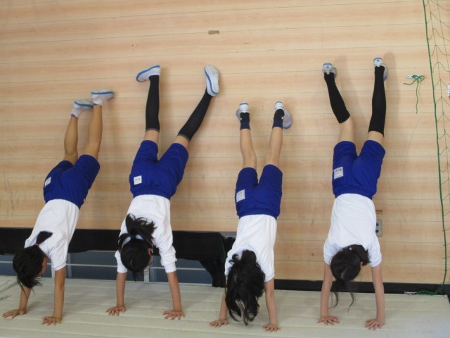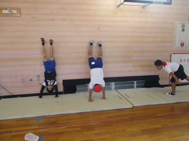 まずは壁倒立や開脚前転、開脚後転などの練習を一人一人がしました。