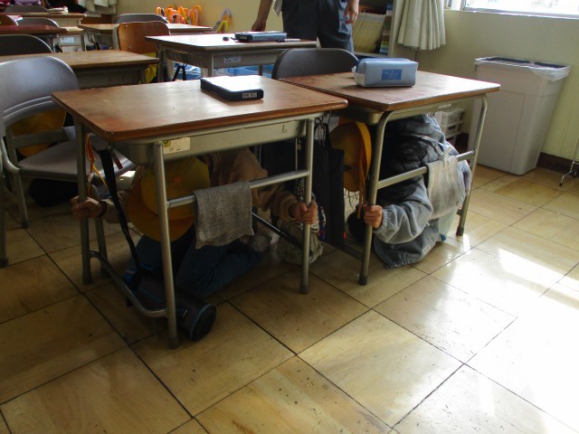 地震のときは机の脚をもってシェイクアウトの姿勢をしました。
