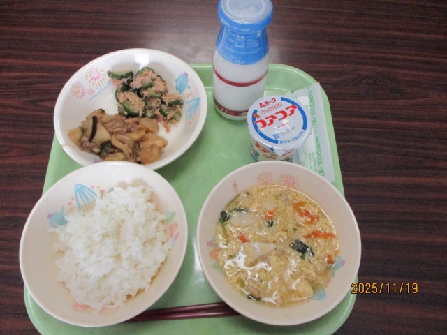 11/19(水) 今日の給食 公開日 2025/11/19 更新日 2025/11/19 ひがしっ子ライフ 今日のメニューはごはん 牛乳 梅味ぶたこまだいこんきゅうりのツナ和え かきたま汁 ヨーグルト でした。今日は「愛知を食べる学校給食の日」でした。米、牛乳、豚肉、大根、ニンジン、ナス、卵、三つ葉は愛知県産の食材でした。今日もおいしくいただきました。 1年生 2年生 3年生 4年生 5年生 6年生 ひまわり組