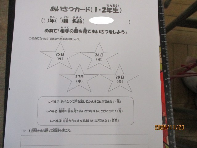 今回のめあては「相手の目をみてあいさつをしよう」です。