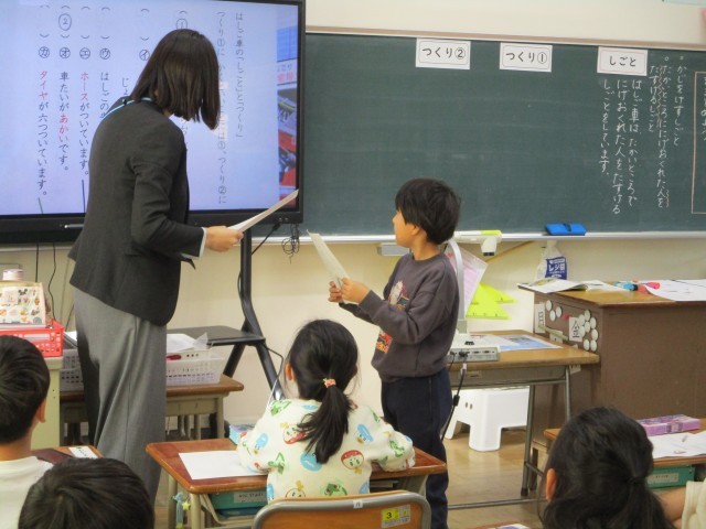 消防自動車のつくりの特徴6つの中から2つ選んでその理由をインタビュー形式で発表し合いました。