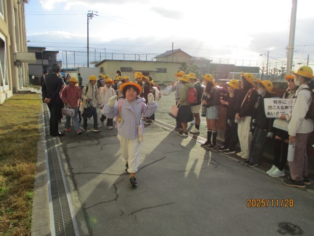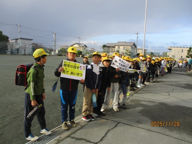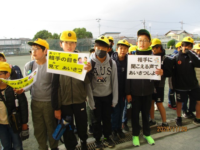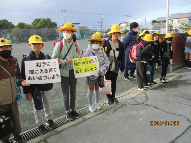 生活委員を中心にボランティアの子どもたちが昇降口前に並んであいさつをしてくれました。