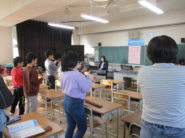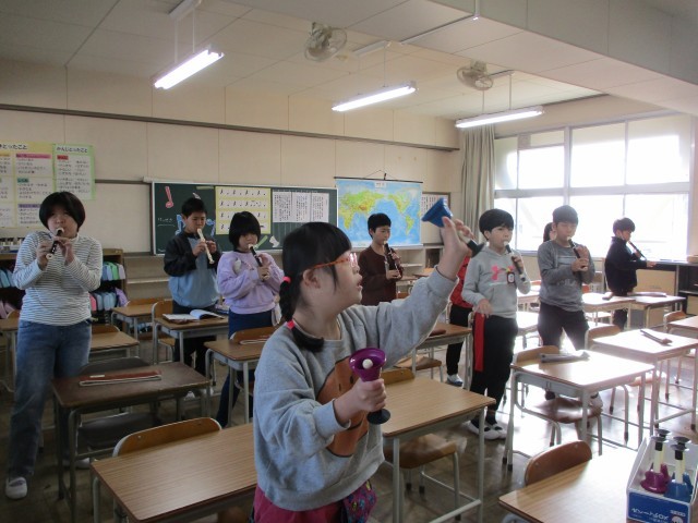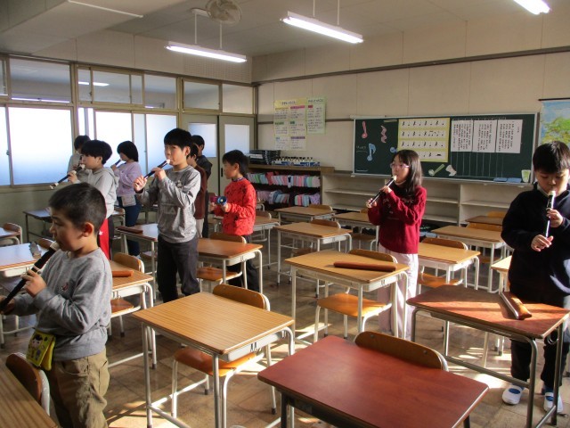 リコーダーとハンドベルで、「さくら笛」を演奏しているところです。