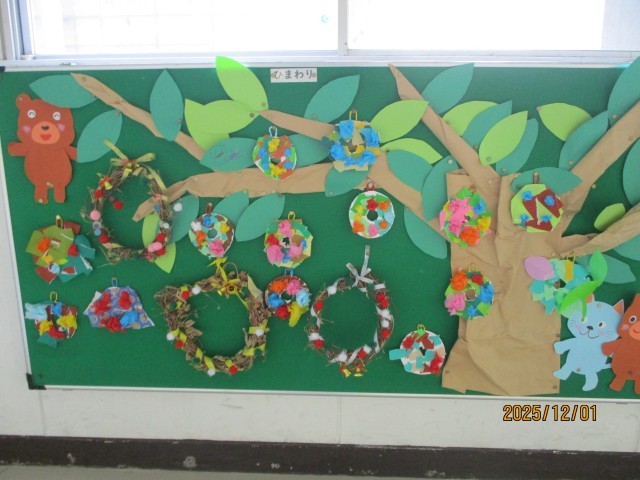 アサガオのつるでつくったクリスマスリースとみんなが紙でつくったクリスマスリースが飾られています。