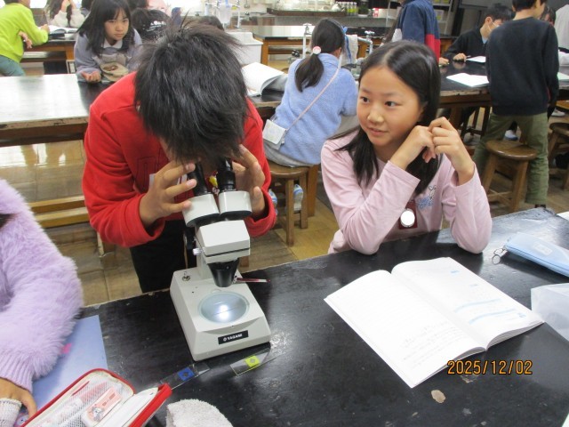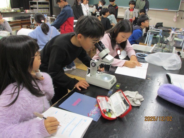 12/2(火)5年 顕微鏡で観察しよう 公開日 2025/12/02 更新日 2025/12/02 5年 理科の時間に食塩水やミョウバンの水溶液の結晶を顕微鏡で観察しました。顕微鏡の使い方も慣れ、グループごとにしっかりできました。 5年生 ひまわり組