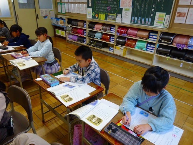 今日は「たぬきの糸車」の3場面の学習です。まず、全員で声を揃えて心を一つにして音読しました。次に、わなにつかまってしまったたぬきを助けたおかみさんの気持ちと、助けてもらったたぬきの気持ちを考え、発表し合いました。どの子も「がんばったよ」と振り返ることができました。