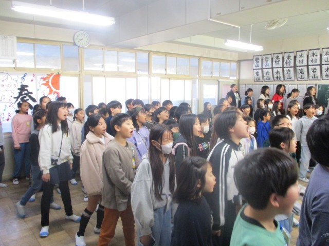 学習発表会に向けて、各クラスが合唱の発表会を行っています。合唱後は、発表を見たクラスから良かった点について感想を述べてもらい、次の発表するクラスにバトンを渡しています。3学期の学習発表会に向けて、子どもたちの思いを大切にしながら練習に励んでいきたいと思います。