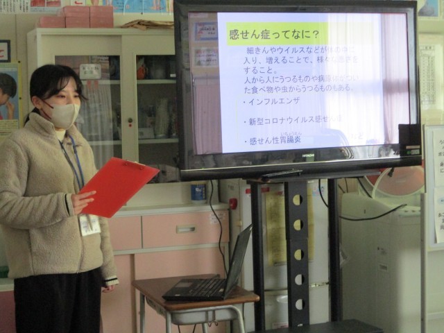 発育測定のあと保健室の先生から感染症予防についてのお話を聞きました。