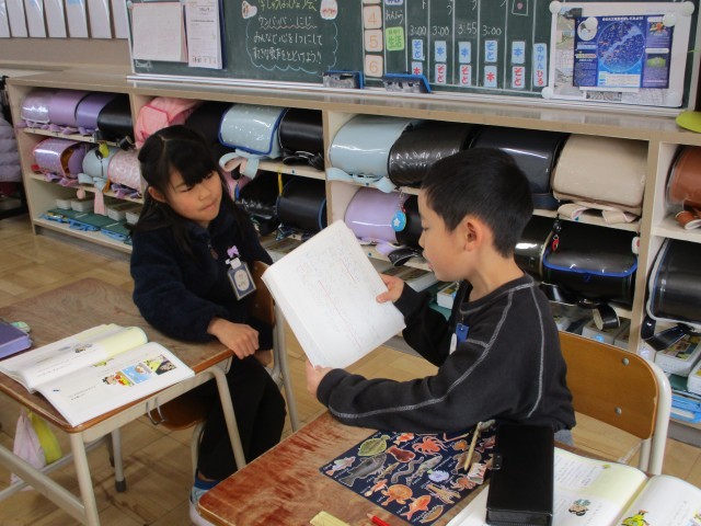 まずは隣同士でどんな文をつくったのか伝え合いました。