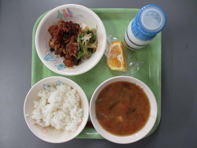今日の献立は、「ご飯、牛乳、とり肉のごまてり、骨太和え、冬野菜たっぷりみそ汁、いよかん」です。