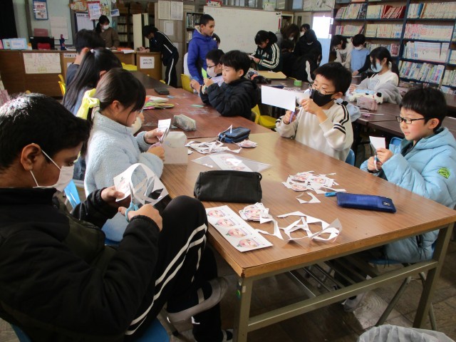 図書委員会はゆきだるま読書週間でビンゴしたりスタンプカードがたまった子に渡すしおりやチケットづくりに大忙しでした。