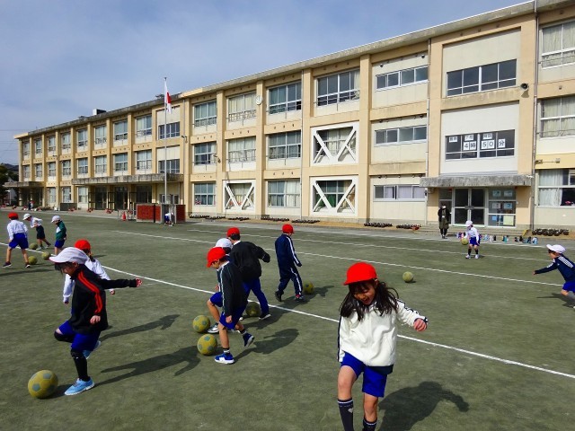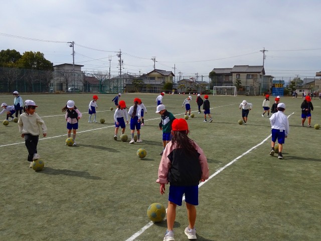 ぼーるけりゲームの授業に取り組んでいます。子どもたちは、ボールの扱い方がだいぶ上手になってきました。「ボールとなかよし」を合言葉に、楽しく元気にボールを追いかけていました。