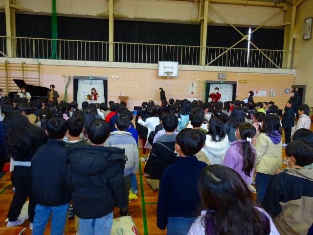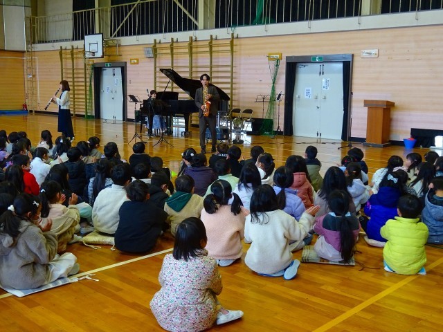 「デュオつむぎ」「メンターズ」さんに来ていただき、ピアノ、バイオリン、クラリネット、サクソフォーンの演奏を楽しみました。レット・イット・ゴー、ドレミの歌、さんぽなど知っている曲がたくさんあり、1年生のみんなが笑顔で一緒に歌う姿がほほえましかったです。最後に歌った大和東小学校の校歌が大変盛り上がり、すばらしい時間になりました。