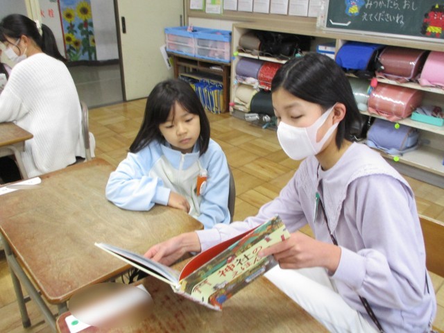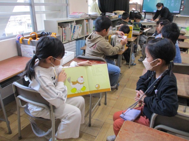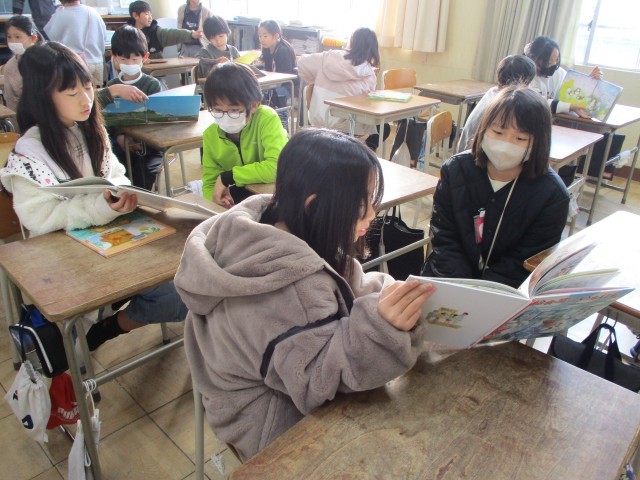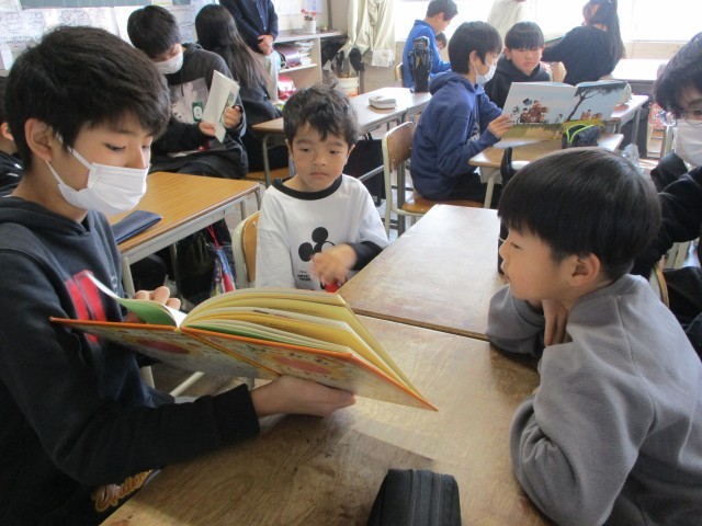 高学年が低学年の子どもたちに絵本を読み聞かせている姿はとても穏やかで優しい雰囲気です。