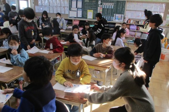 2/17(火) 2年 ペア活動 公開日 2026/02/18 更新日 2026/02/18 2年 ペアなかよし感謝の会とペア遊びがありました。感謝の会では、1年間一緒に活動してくれた4年生に「ありがとう」の気持ちをこめた手紙を送りました。ペア遊びでは、ドッジボールをして楽しみました。4年生は、柔らかくボールを投げてくれたり、取ったボールを2年生に投げさせてくれたりと優しく接してくれました。この1年間ペア活動では、4年生と微笑ましい時間を過ごすことができました。 +1 2年生 ひまわり組