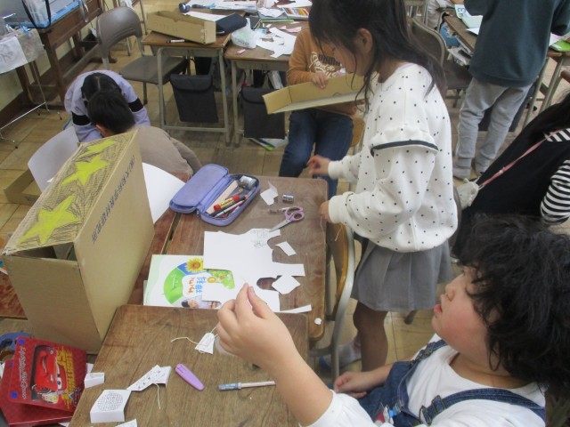 ゴムやじしゃくなどを使い、楽しいおもちゃにするために一生懸命作っていました。