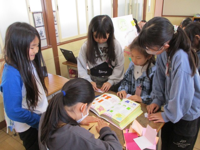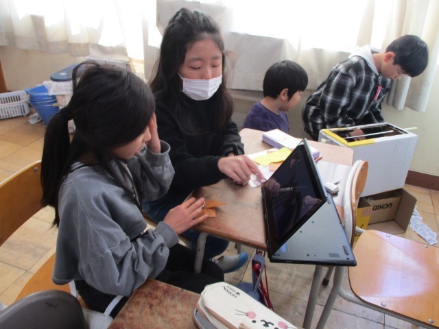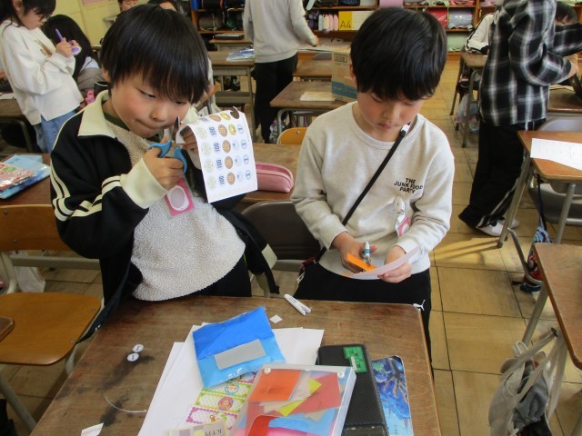 あとはみんなにあげる商品を友達と色紙でつくっていました。