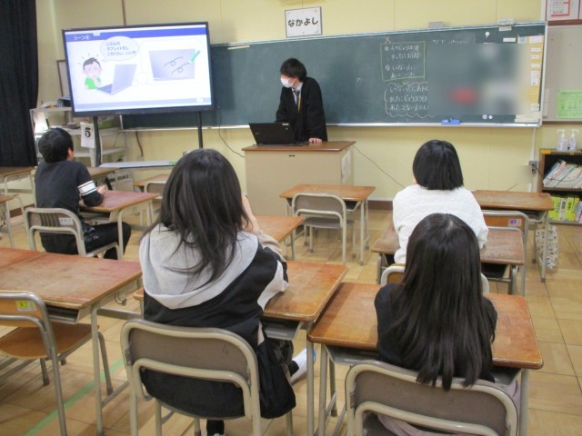 高学年の子どもたちがICT支援員の方から情報モラルについてお話を聞きました。
