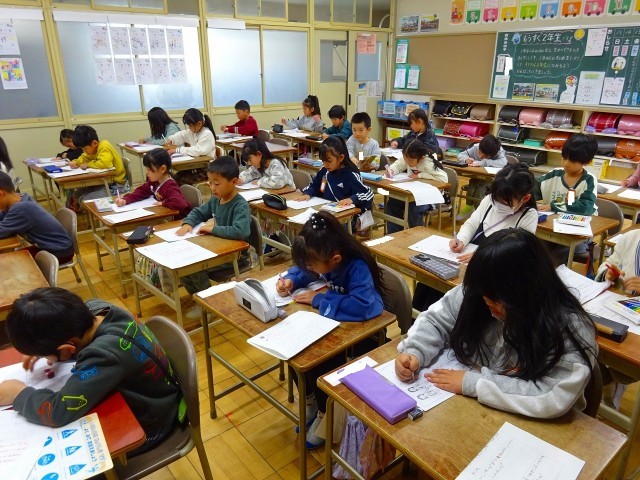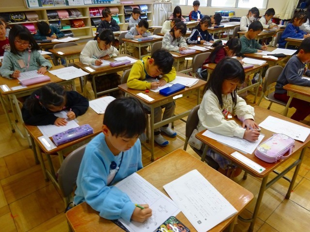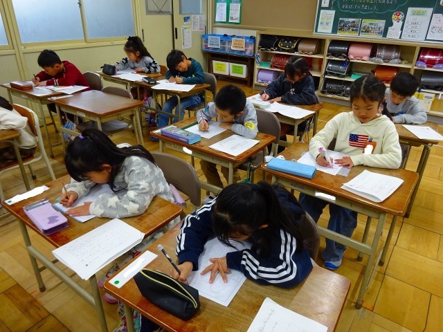 もうすぐ二年生。一年生になってからあった、たくさんのいいことを思い出してみんなで紹介し合い、自分が一番心に残ったことを絵と文に書きました。真剣な表情で集中して取り組む様子が、とても素敵でした。