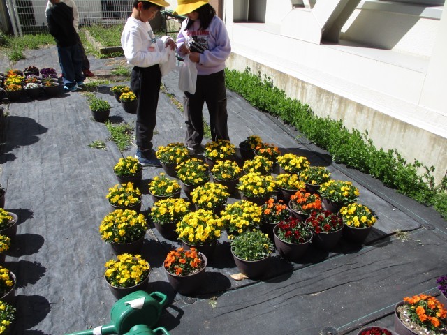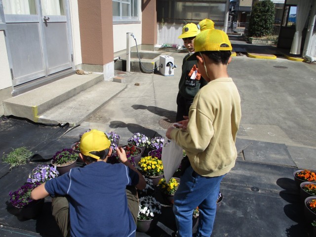 今週行われる卒業式の会場を飾るために、花の鉢を運びました。
