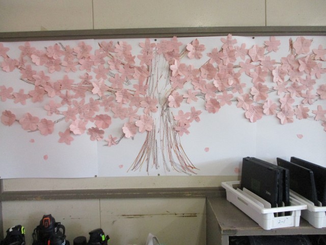 6年生の教室の後ろに桜の掲示物がありました。