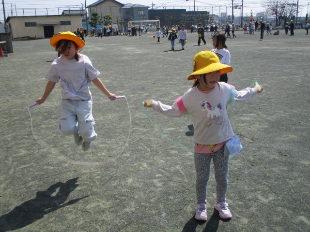 なわとび、鉄棒、おにごっこ、ドッジボールなど友達と楽しく遊んでいました。
