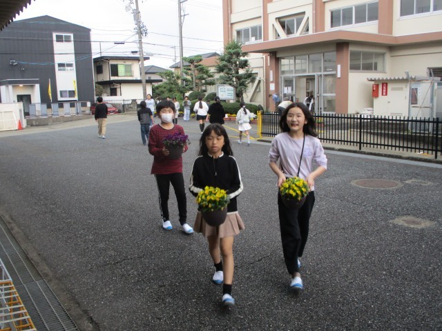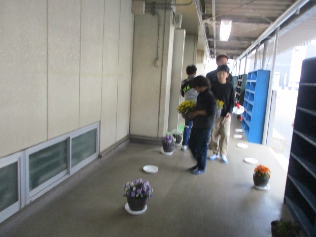 入学式の会場はいすを並べたり、花を半込んで並べたりしました。