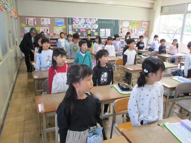 「起立、礼、着席」の仕方など先生のお話を聞いて頑張っていました。