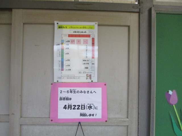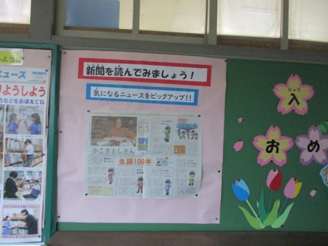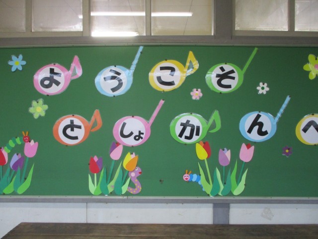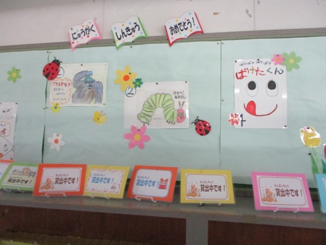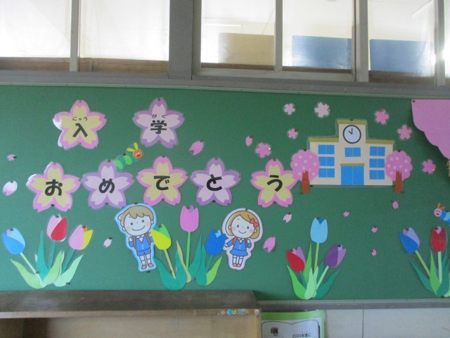 掲示物には「入学おめでとう」「進級おめでとう」など春の掲示物になっています。