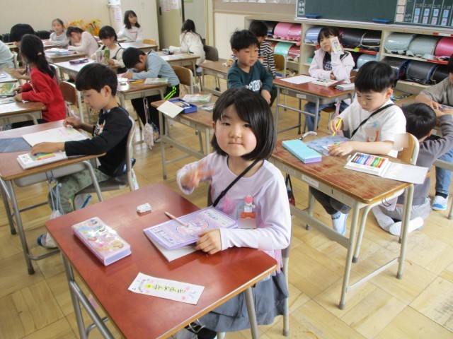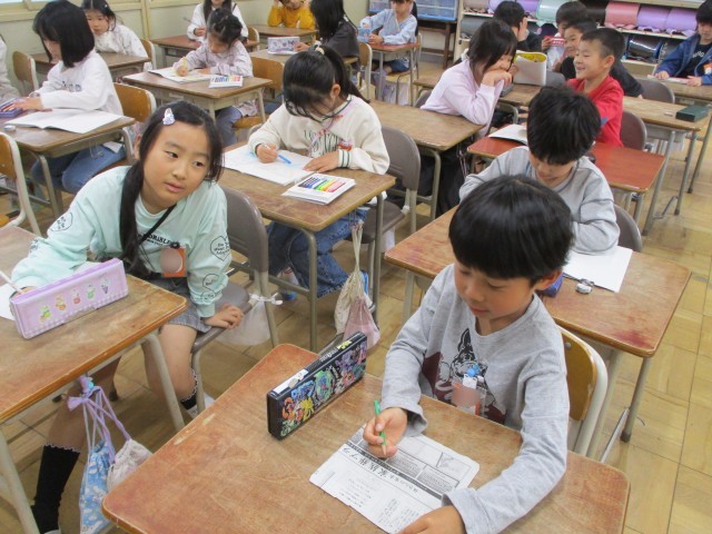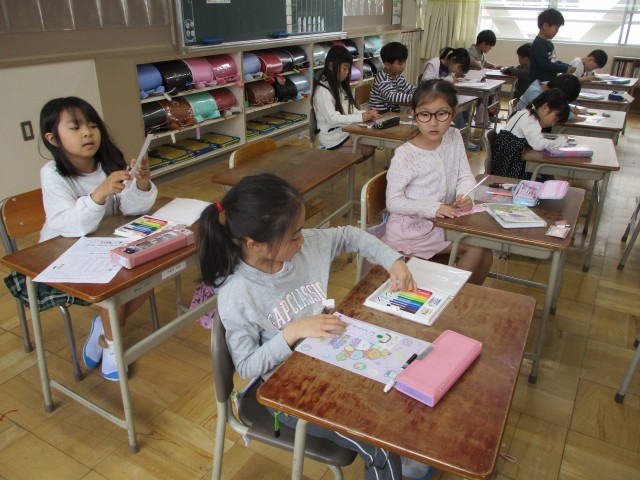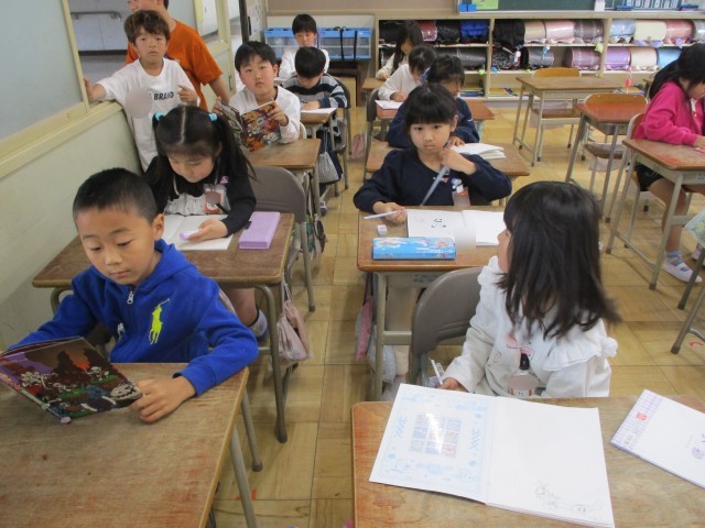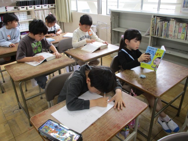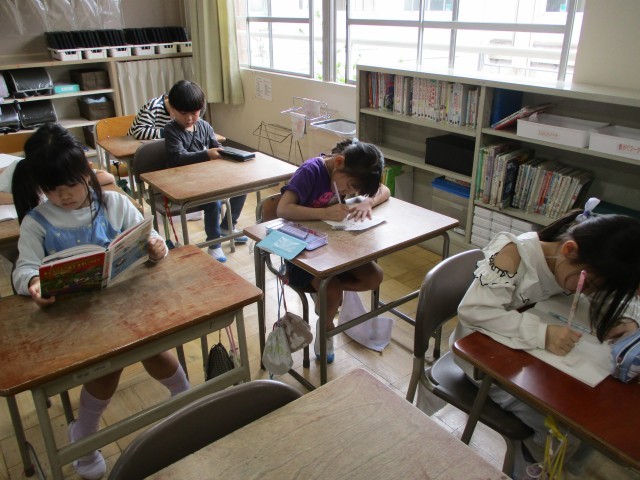2年生は学級文庫の本を読んだり、自由帳に絵を描いたり、日直用の名札をつくったりして過ごしていました。
