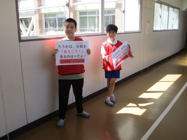 渡り廊下では生活委員さんが「廊下は右側を歩こう」と呼びかけてくれていました。