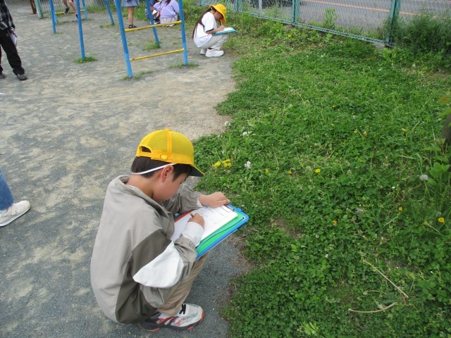 春の生き物を観察しました。植物の葉の形、花の色、大きさ、多くの特徴を観察していました。