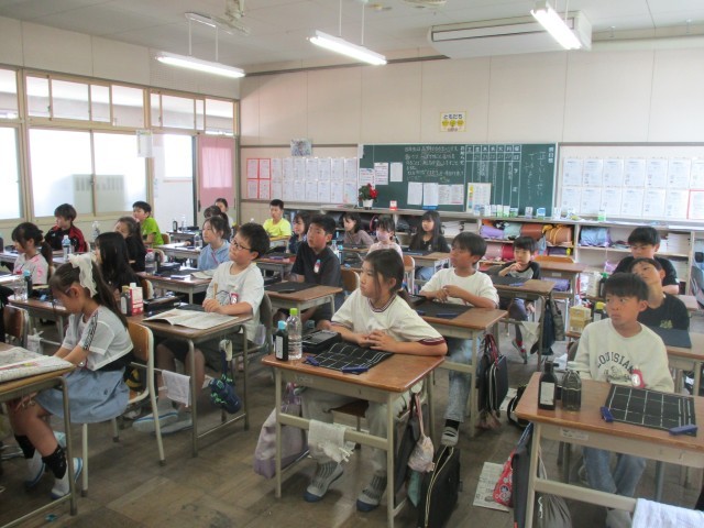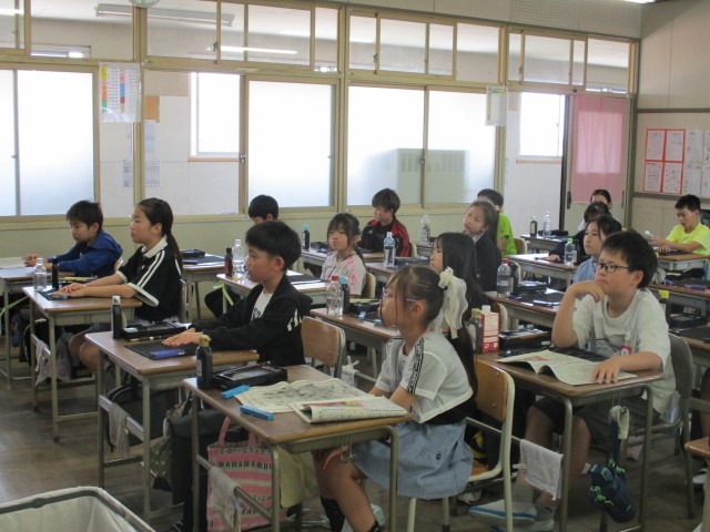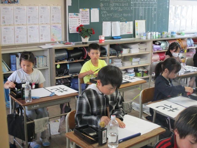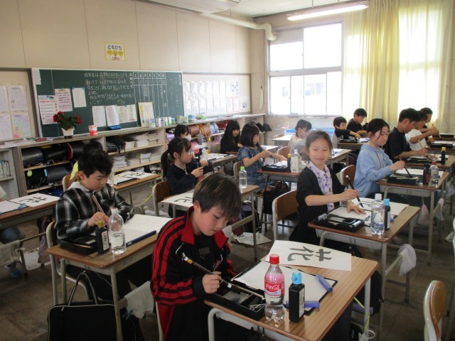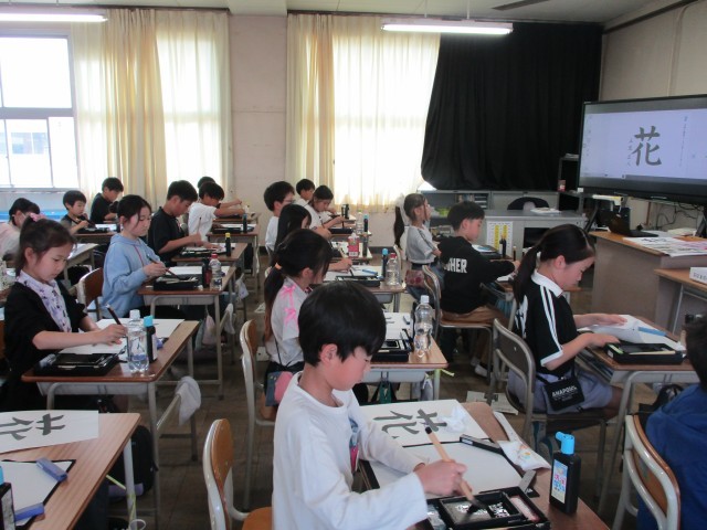 2回目の習字の授業でした。姿勢を正しくして、筆を縦にして「花」という字を書きました。