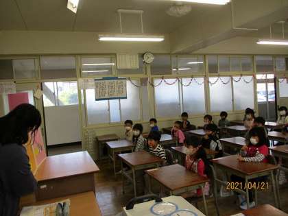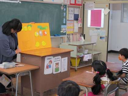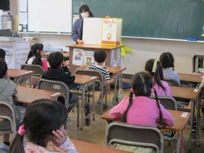 読み聞かせボランティアの方が、大型絵本の読み聞かせをしてくださいました。大きな絵本に惹きつけられて、お話を楽しんでいました。読み聞かせの後には、通常の大きさの絵本を紹介してくださったので、自分でも読んでみたいなと感じたようです。来週から、順番に図書館の使い方のオリエンテーションをしていくので、楽しみにしていてくださいね。