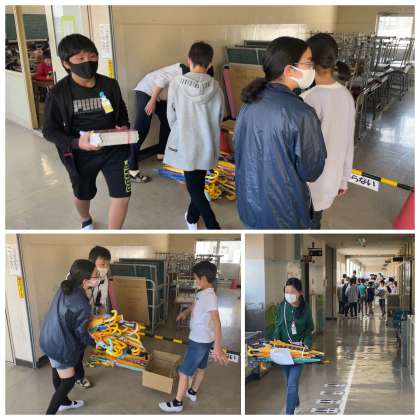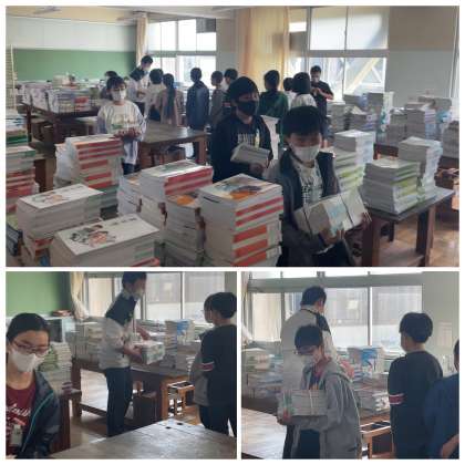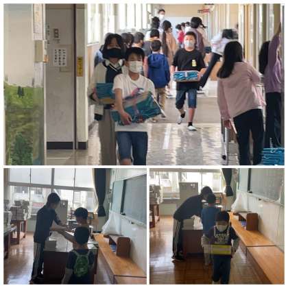 朝の学校の様子です。年度初めは、教科書の配付や教室の中の荷物の整理など、たくさんのものを運んで準備に大忙しです!